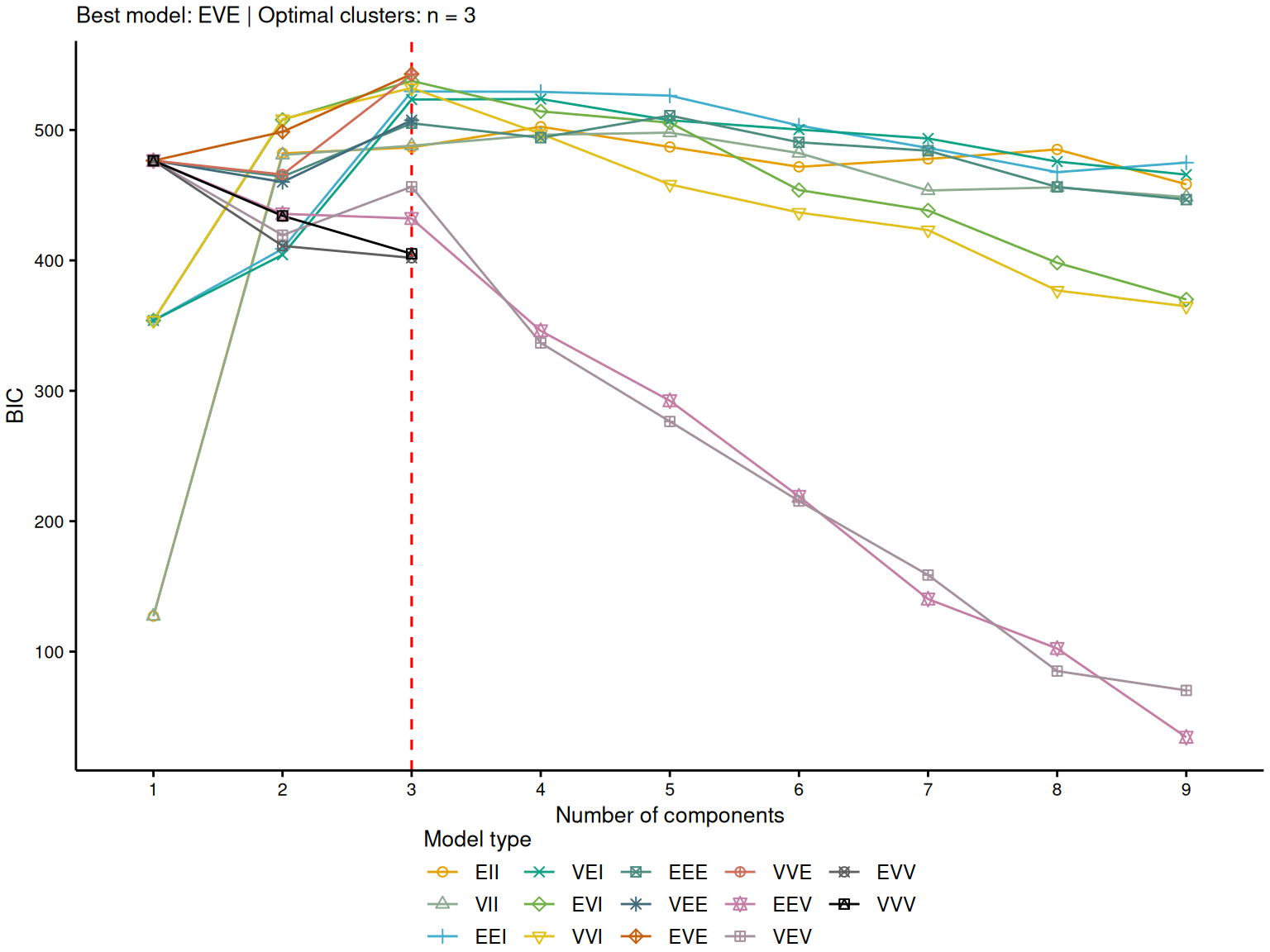 There are no generally accepted rules regarding minimum sample sizes in clustering procedures. For model-based clustering procedures Dalmaijer et al. (2022) recommended N = 20 to N = 30 per expected cluster with medium to large effect sizes (i.e., cluster separation), which would translate into two to four clusters in our sample. Given the present dataset, the comparison of various GMM types with different number of clusters using the BIC showed that the best solution was a model with three ellipsoidal clusters of varying shapes, equal volume and orientations (EVE model, see Figure 3).