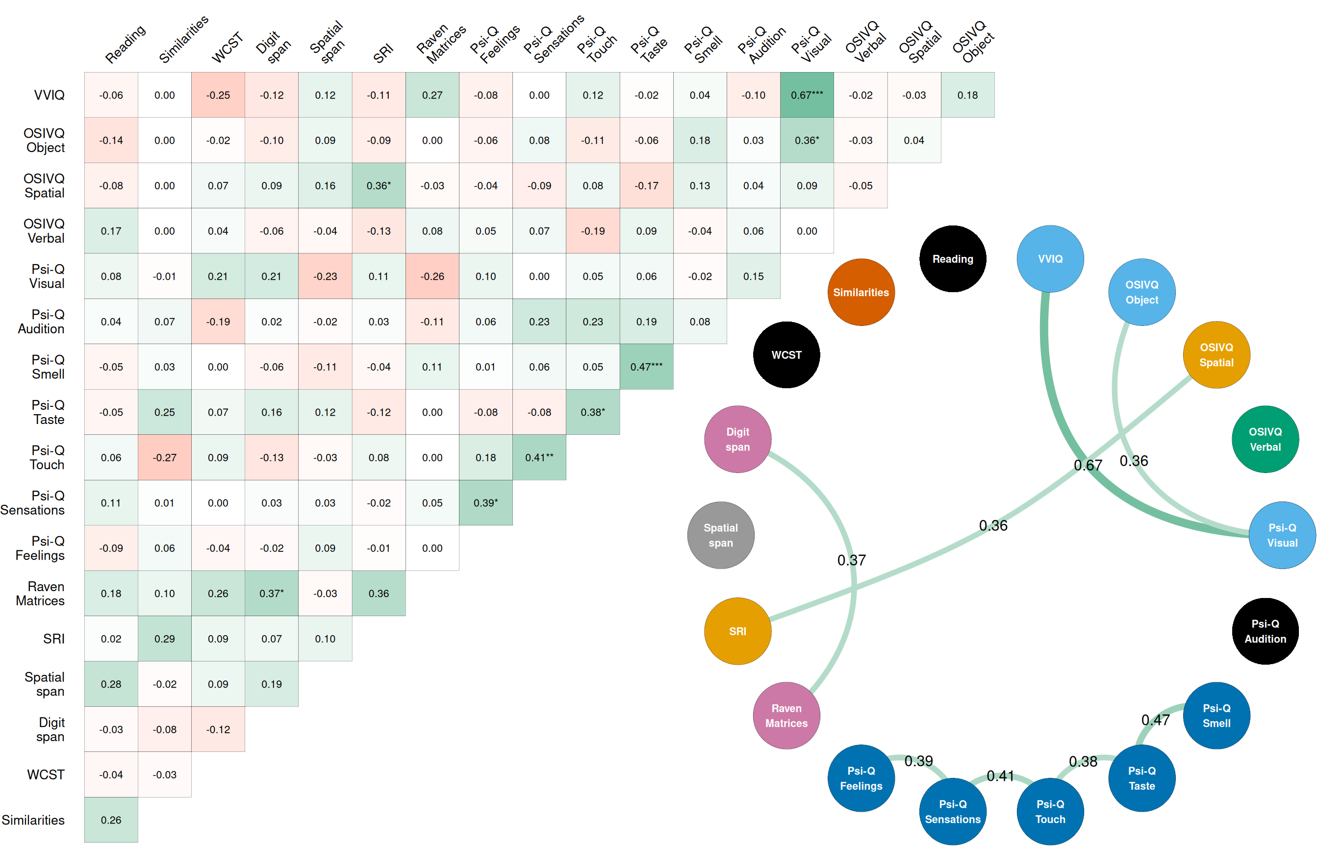 We computed all the partial correlations between the 18 variables (see Figure 2) and chose to merge the significantly correlated variables after a Bonferroni correction (multiplying the p-values by the number of comparisons). This resulted in the creation of four new reduced variables. First, the three subscales related to visual imagery, i.e., the VVIQ, the OSIVQ-Object and Psi-Q Visual, were associated (VVIQ - Psi-Q Visual: r = 0.67, p 0.001; OSIVQ-Object - Psi-Q Visual: r = 0.36, p 0.05). They have been standardised between 0 and 1, weighted by their number of items (16, 15 and 3 respectively) and merged into a single “Visual imagery” variable to obtain as balanced a continuous measure of imagery as possible. Second, the OSIVQ-Spatial and the score of the SRI, i.e., subjective and objective spatial imagery, were associated (r = 0.36, p 0.05). They have been standardised and merged in a single “Spatial imagery” variable. Third, five Psi-Q sensory imagery subscales (Smell, Taste, Touch, Sensations and Feelings) were associated (Psi-Q Smell - Taste: r = 0.47, p 0.001; Taste - Touch: r = 0.38, p 0.05; Touch - Sensations: r = 0.41, p 0.01; Sensations - Feelings: r = 0.39, p 0.05). They have been standardised and merged into a single “Sensory imagery” variable. Fourth, the score for the Raven matrices and the Digit span were associated (r = 0.37, p 0.05). They have been standardised and merged in a common “Raven + Digit” variable. Based on the link established between the reverse digit span and measures of intellectual or executive functions (Groeger et al., 1999), we interpreted this variable theoretically as a proxy for general cognitive performance.