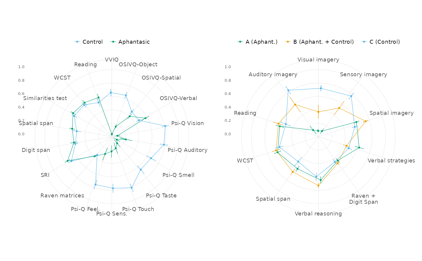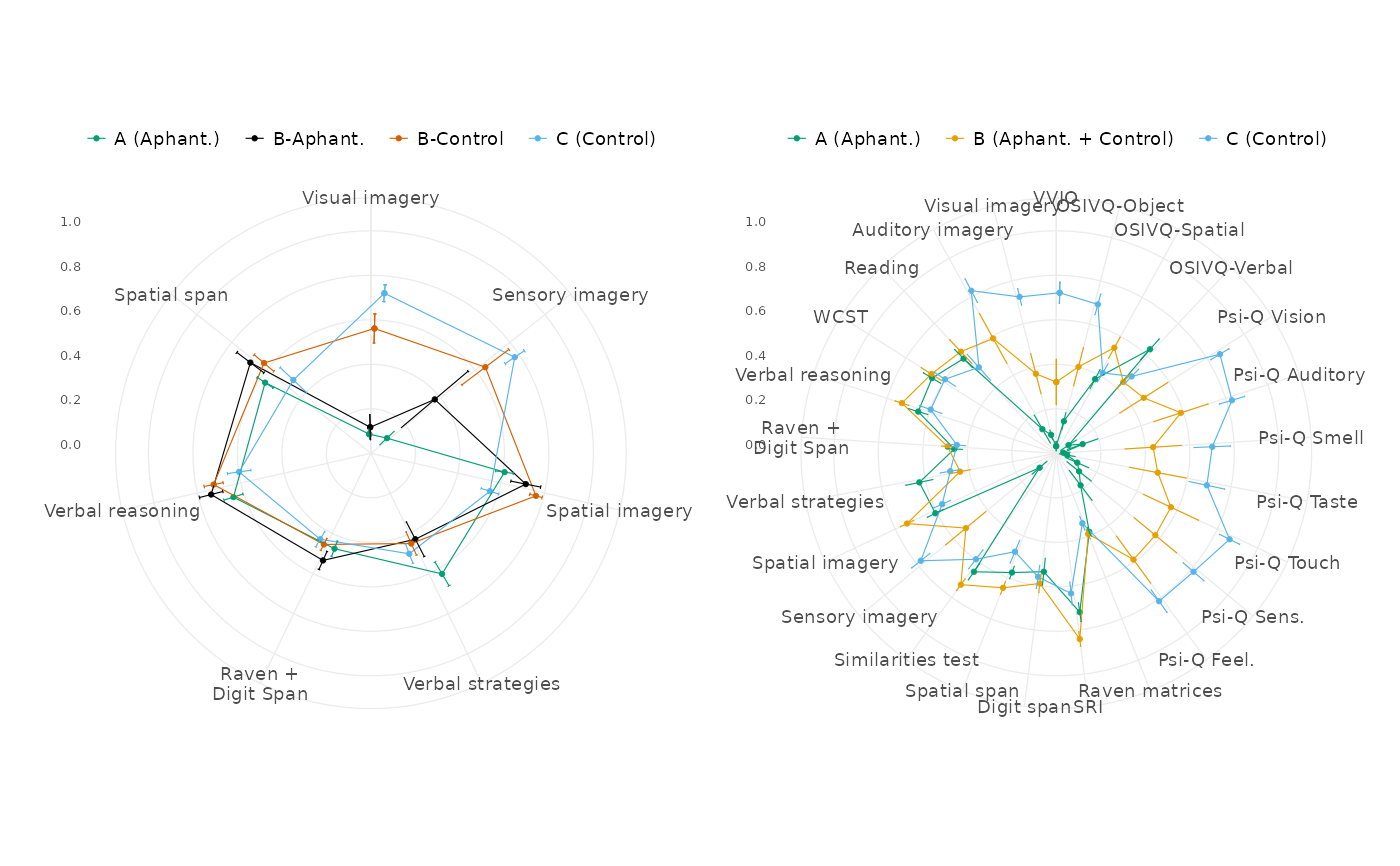 The function allows for customisation of the radar charts with various options. Note that the default sizes are pretty small, this was designed to render best as small dimension PDF vector figures for journals.